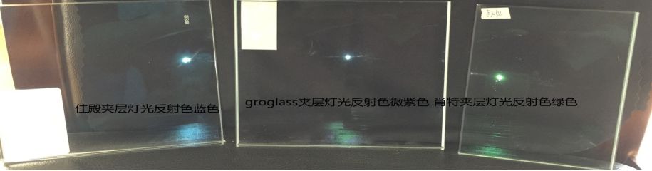 由于各家低反射原片不同,采取的生产方式也不同,金属镀膜膜层的配方比例更不相同,导致成品玻璃会出现不同的反射色,见下图。
