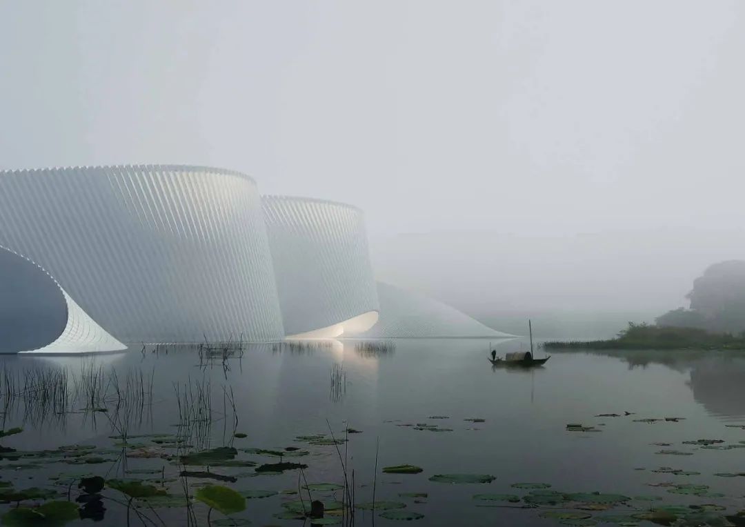建筑嵌入地景,带来“大地景观”的感受,形态有机、舒展,曲线优美。
